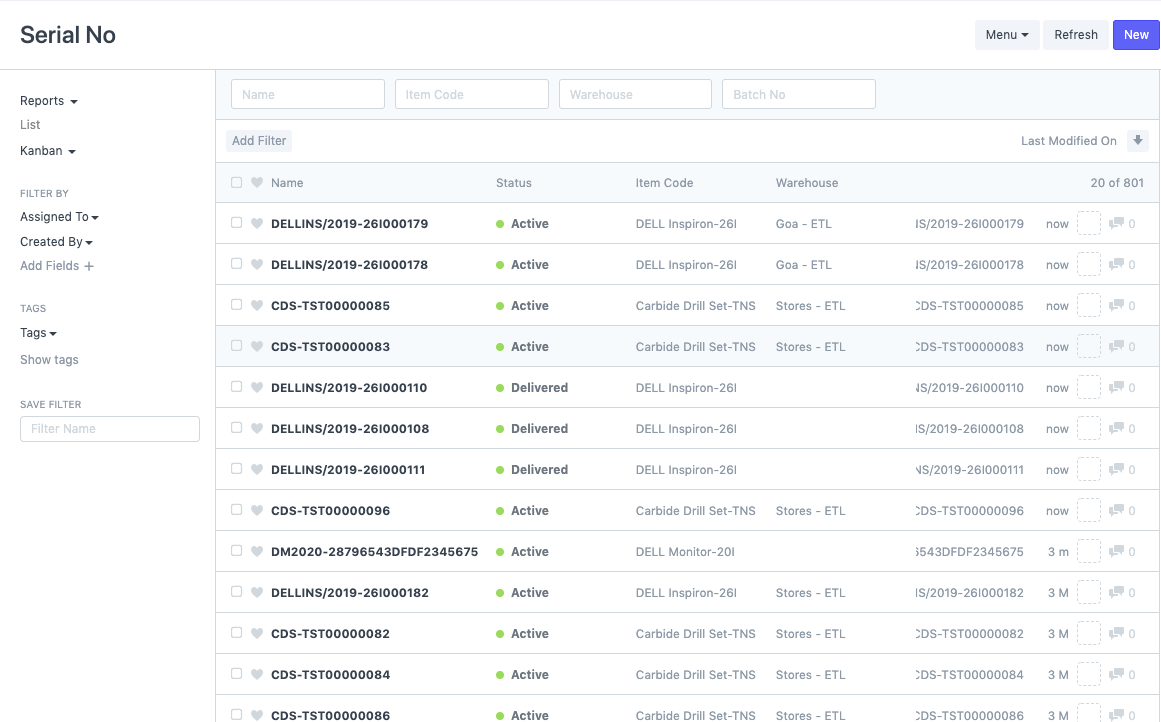Use serial numbers to uniquely identify units. Set up naming series, and software will automatically create serial numbers for new stock. You can even scan item barcodes via your device camera for easy search through all your stock.