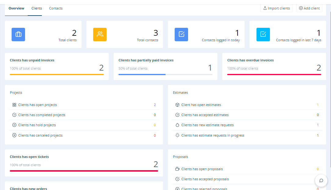 Manage your customers and the contacts of the customers. You can allow to register customers or add your customers manually. Get the detail information about contacts, projects, invoices, payments, estimates, estimate requests, support tickets, essential files, events and notes for each clients. You can allow your clients to use the client portal. Each clients will get individual dashboard to see their projects, invoices and other information. Let your clients follow up the projects and get feedback instantly. Set permissions for the clients to limit their access.