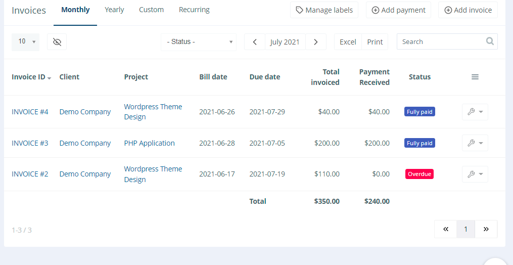 Add your custom invoices and send email with attached invoice pdf to your clients. It supports different currency for different clients. Get records of your invoices and filter by different statuses. Set multiple taxes in the invoices. Change the invoice color and logo to match with your brand. Set custom footer in the pdf for additional information.
